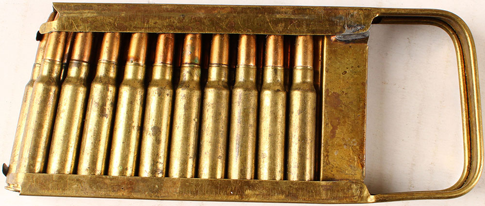 Italian Breda Modello 30 stripper clip, brass clips with 20 Rds. Of 7.35 x 51mm carcano. Grade: Very Good + - Value: 20 to 80