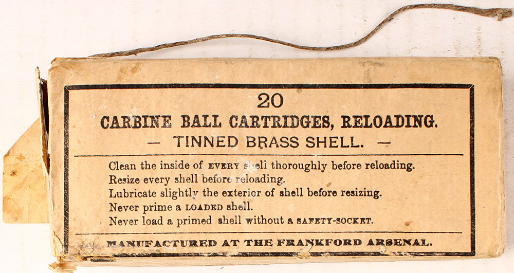 Frankford Arsenal, Carbine ball Cartridges, reloading (45-70) tinned brass shell, top of box is stamped, ''INITIAL VELOCITY.'', ''??63 FEET.'', ''??00'', 1pc, FULL & SEALED, buff box & label with black print, left side of top seal has been glued but seal is still mostly intact, bottom left of box has small hole, light age soiling, light stains, edge wear & rub marks. Grade: Very Good - Value: 20 to 100