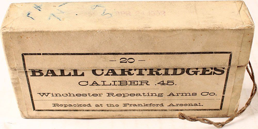 Frankford Arsenal, .45 Ball Cartridges (45-70), top of box has a faint stamp hat reads, ''APR 24 1902'', 2pc, FULL & SEALED, buff box & label with black print, box is solid with light age soiling, pen marks on top, light edge wear & light rub wear. Grade: Very Good ++ - Value: 20 to 80