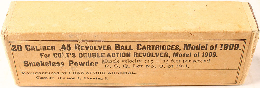 Frankford Arsenal, .45 Revolver Ball Cartridges, model of 1909, smokeless powder, 1pc, FULL & SEALED, buff box & label with black print, box is solid with light rub wear. Grade: Excellent ++ - Value: 20 to 40