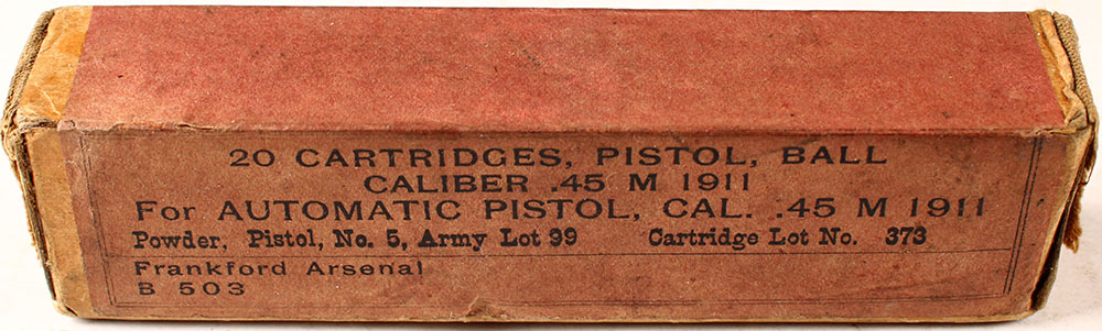 Frankford Arsenal, .45 M1911 pistol ball, 1pc, FULL & SEALED, buff box with red label & black print, box is solid with wear form bullets on bottom, pencil marks on bottom, light age soiling, light rub wear & light edge wear. Grade: Very good ++ - Value: 10 to 30