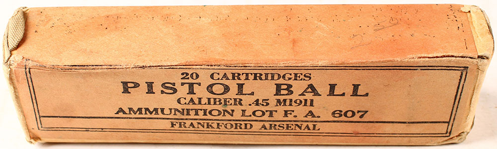 Frankford Arsenal, .45 M1911 Pistol Ball, 1pc, FULL & SEALED, buff box & label with black print, box is solid with light rub wear & tear in bottom back right seam. Grade: Excellent - Value: 10 to 30