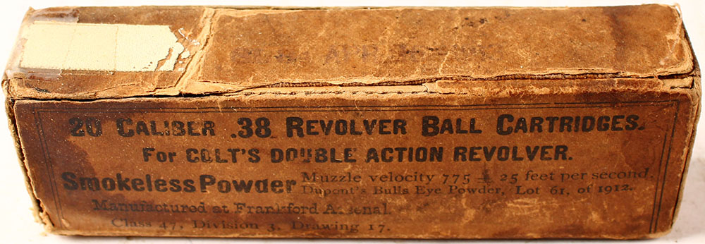 Frankford Arsenal, .38 Revolver Ball, Smokeless, 1pc, Full, buff box with red label & black print, box is weak with multiple split seams, tape, rub wear, edge wear & age soiling, ammo is fair. Grade: Fair ++ - Value: 10 to 30