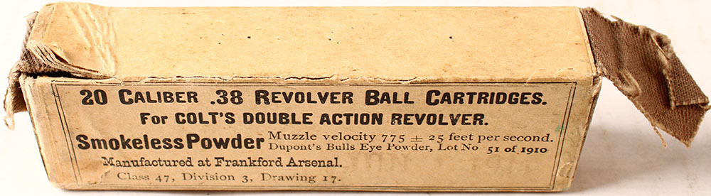 Frankford Arsenal, .38 Revolver Ball, Smokeless, 1pc, Partial 19 Rds. But sealed, buff box & label with black print, box is solid with top seal partially torn, light age soiling & light rub marks, ammo is good. Grade: Very Good ++ - Value: 2 to 30