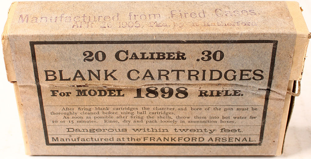 Frankford Arsenal, .30 Cal model 1898 (30-40) Blanks, stamped on top, ''Manufactured from fired cases'', ''APR 26 1905 PKD BY R RUTHERFOR'', 2pc, FULL & SEALED, buff box with blue label & black print, box is solid with light wear. Grade: Excellent + - Value: 10 to 30