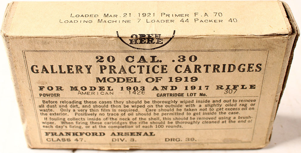 Frankford Arsenal, .30 Gallery Practice Cartridges, Model of 1919, 1pc, FULL & SEALED, buff box & label with black print, box is solid with light age soiling, edge wear & light rub wear. (1216) Grade: Excellent - Value: 20 to 40