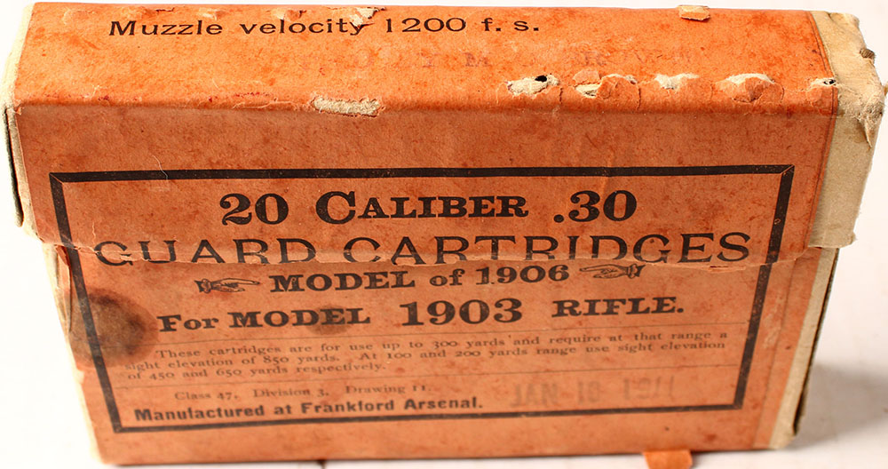 Frankford Arsenal, .30 Guard Cartridges, Model of 1906, 2pc, Full, buff box with orange label & black print, box is solid with wear from bullets on top, age soiling & light rub wear, ammo is very good. Grade: Very Good + - Value: 20 to 40