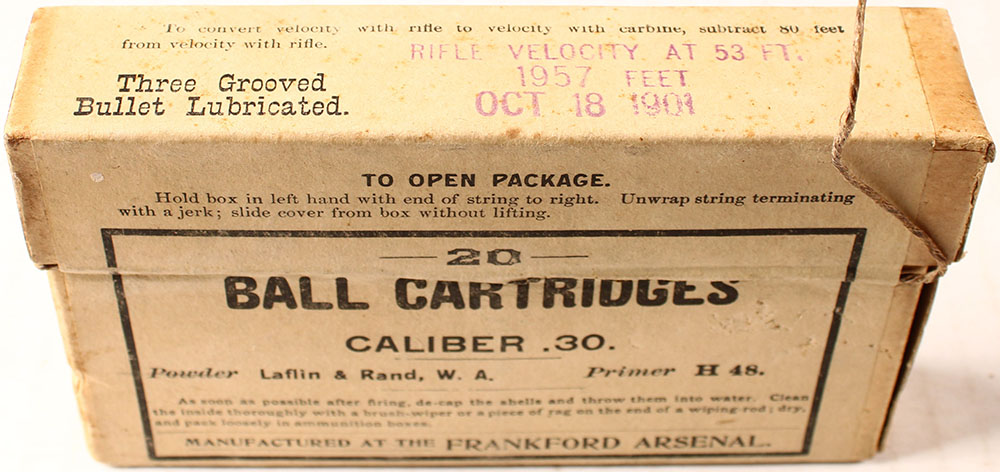 Frankford Arsenal, .30 Ball Cartridges (30-40 Krag), 2pc, FULL & SEALED, buff box & label with black print, box is solid with stain on bottom & rub wear. Grade: Excellent + - Value: 20 to 40