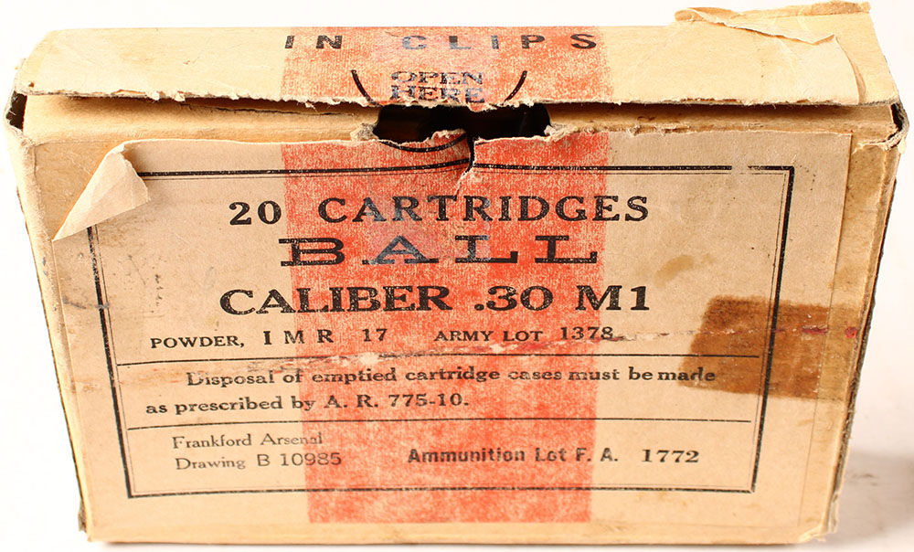 Frankford arsenal, .30 M1 Ball, 1pc, Full, buff box with buff/orange label & black print, box is solid with tape marks, rub marks, light edge wear, & partial tear on top flap seam, ammo ranges from very good to good. Grade: Very Good ++ - Value: 20 to 40