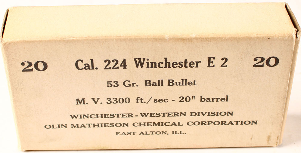 Winchester-Western Olin, .224 Winchester E2, 53 Gr., 1pc, Partial 18 Rds., white box with black print, box is solid with light age soiling, ammo is very good. Grade: Excellent - Value: 20 to 60