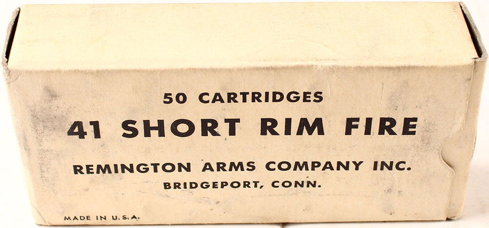 Remington, .41 Short Rim Fire, 1pc, Full, white box with black print, box is solid with rub marks, & light age soiling, ammo is excellent. Grade: Very Good ++ - Value: 100 to 200