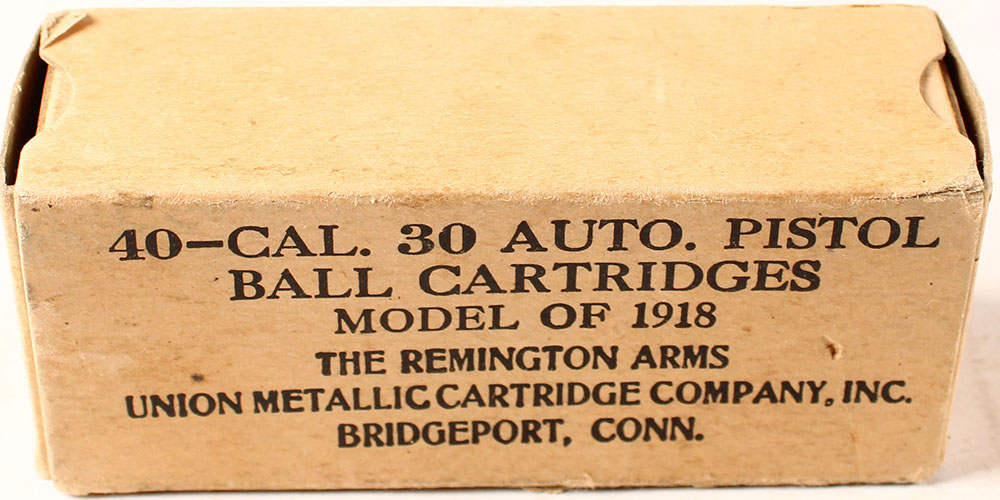 REM-UMC, .30 Auto Pistol Ball, Model of 1918, 1pc, Full, buff box with black print, box is solid with one partial seam split, light rub marks & light edge wear, ammo is excellent. Grade: Excellent + - Value: 40 to 80
