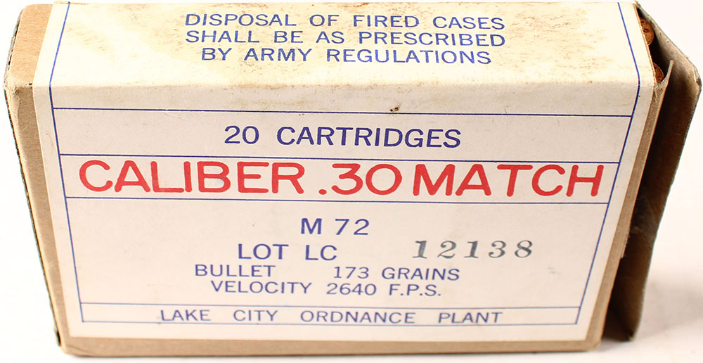 Lake City, .30 Match M72, Lot LC 12138, 173 Gr. Bullet, 1962 Dated, 1pc, Full, buff box with white label & blue/red label, box is solid with one end open, age soiling/stains, light rub marks & light edge wear, ammo is excellent. Grade: Very Good ++ - Value: 20 to 40