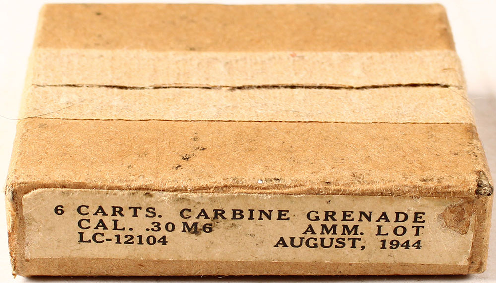 Lake City, .30 M6 Carbine grenade Cartridges (.30 carbine), dated August 1944, 2pc, partial 4 Rds., brown box with buff label & black print, box is solid with light age soiling, light rub marks, & light edge wear, ammo is excellent. (1150) Grade: Excellent - Value: 4 to 50