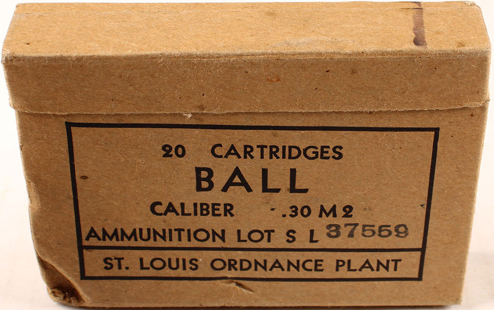 ST. Louis, .30 M2 Ball, Lot S L 37559, 1pc, Full, buff box with black print, box is solid with handling wear, light rub wear & light edge wear, ammo ranges from very good to good. Grade: Excellent - Value: 20 to 40