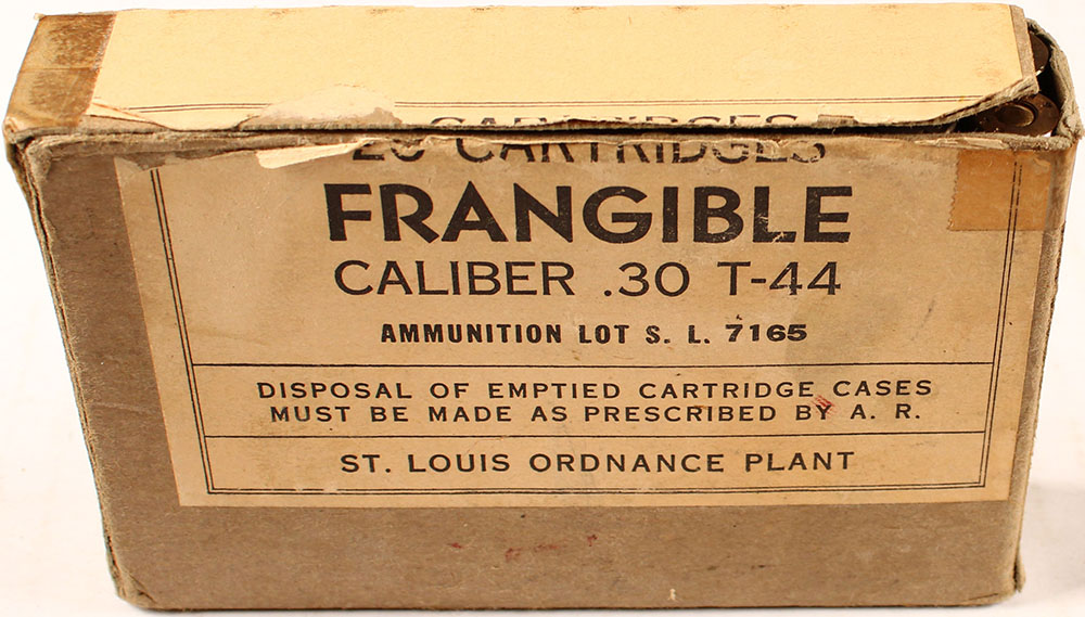 ST. Louis, .30 T-44 Frangible, Lot S. L. 7165, 1pc, Full, buff box & label with black print, box is solid with top open, tape, pen marks, light age soiling, light rub marks & edge wear, ammo is good. Grade: Very Good ++ - Value: 20 to 40