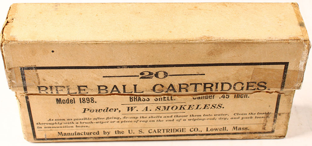 U.S. Cart Co., .45 Model 1898, Smokeless, 2pc, Full, buff box & label with black print, box is solid with tape, light age soiling, & light rub wear, ammo is very good. Grade: Very Good ++ - Value: 20 to 40