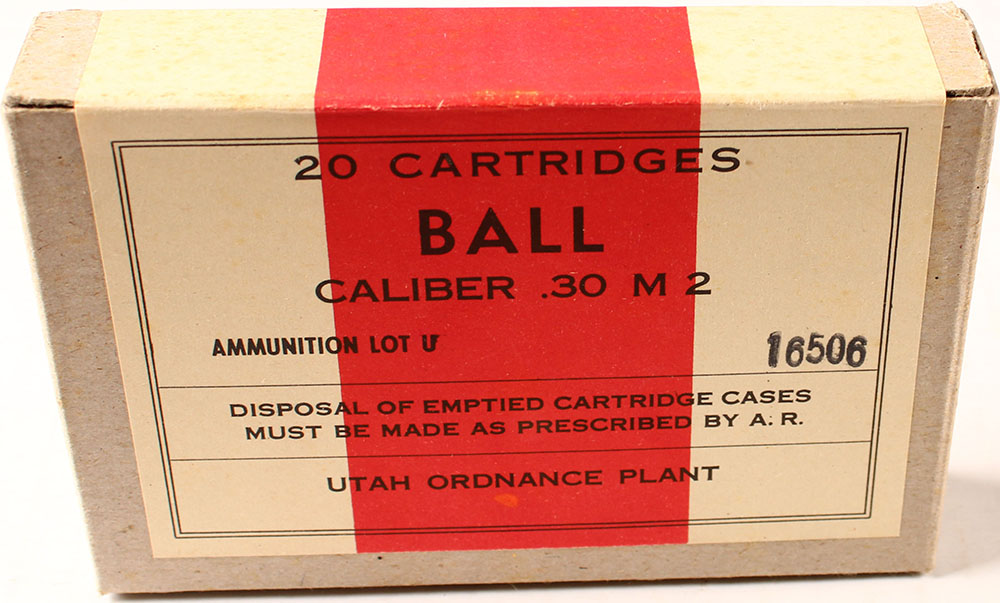 Utah Ordnance Plant, .30 M2 Ball, 1pc, FULL & SEALED, buff box with buff/red label & black print, box is solid with light age soiling. Grade: Near MINT - Value: 20 to 40
