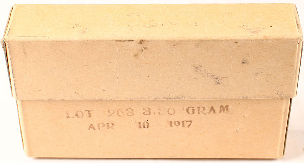 Unmarked, side of box is stamped, ''LOT 263 3,30 GRAM'', ''APR 10 1917'', box is solid with light age soiling, light rub marks & wear from bullets on bottom, ammo ranges from very good to good. Grade: Excellent - Value: 10 to 40