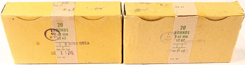 Lot of two, DPA, 7.62mm L2 A2, 1980 dated, 1pc, Both Full, yellow box with buff label & green print, box's are solid with light rub wear, ammo is very good. Grade: Excellent - Value: 30 to 90