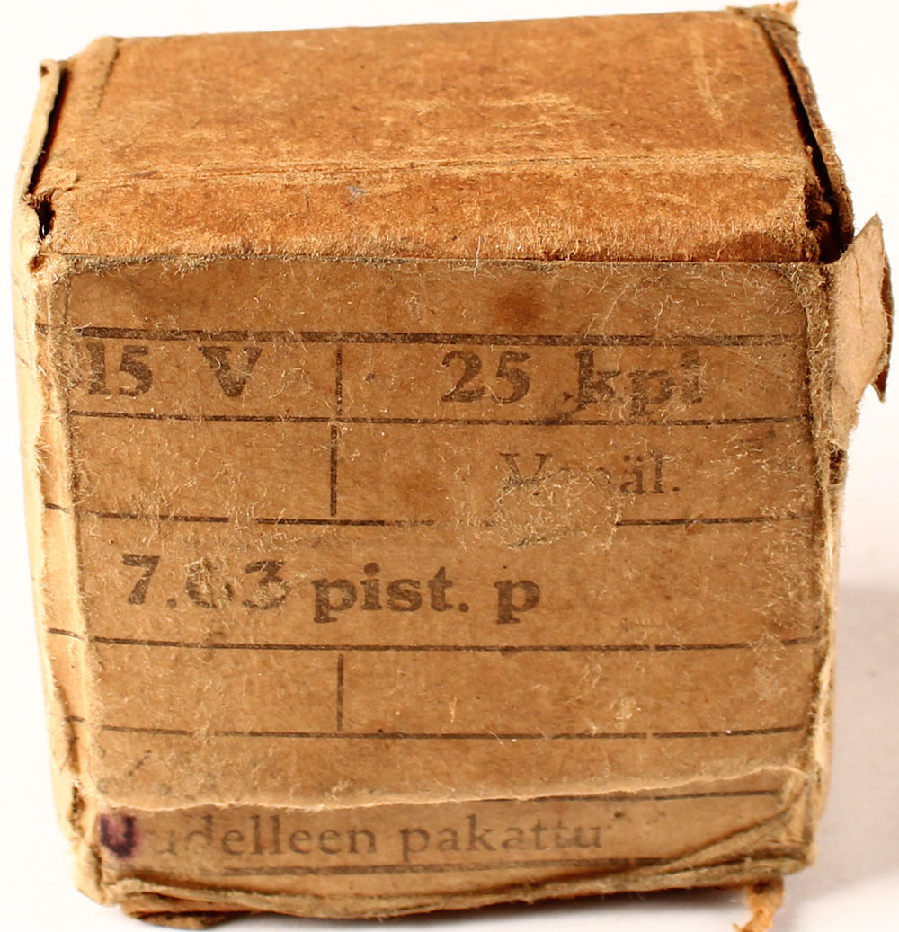 Finnish Uudellen pakattu, 7.63 Pist. P, (.30 Mauser), 1pc, Full, buff box with black print, box is solid with rub wear, handling wear, light age soiling, & light edge wear, ammo is very good. (690) Grade: Very Good ++ - Value: 10 to 30
