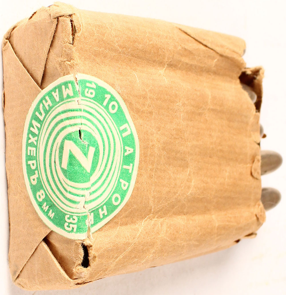 Czech, 8x56mmR, 1935 date, Bulgarian contract, pouch, full, brown pouch with green/white label, pouch has tears & handling wear ammo is excellent. (395) Grade: Very Good - Value: 10 to 30