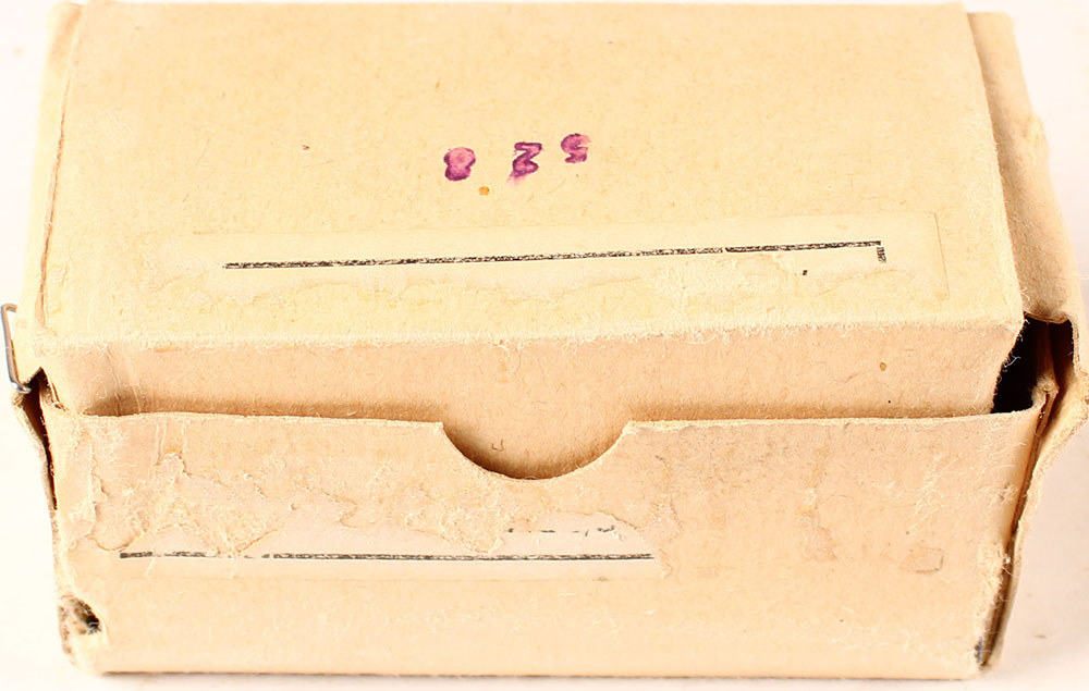 Czech, 7.62 Tokarev on clips, 1pc, Full, buff box with buff label & black print, box is solid with label torn off, handling wear, rub marks & edge wear, ammo is Very Good. Grade: Very Good + - Value: 10 to 30