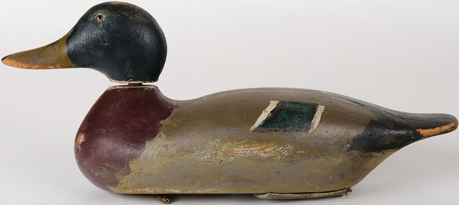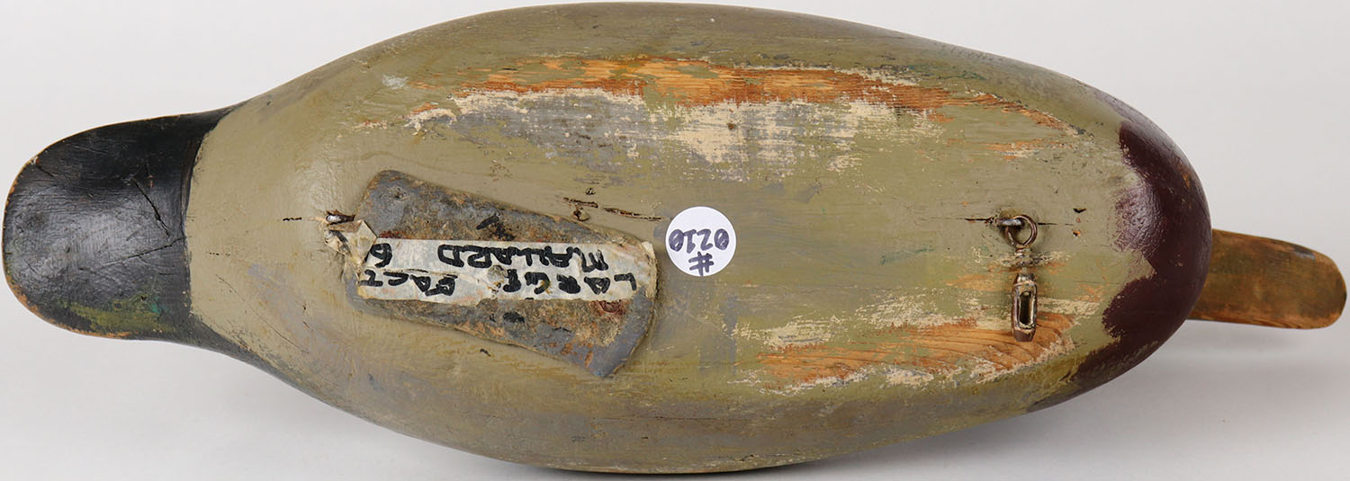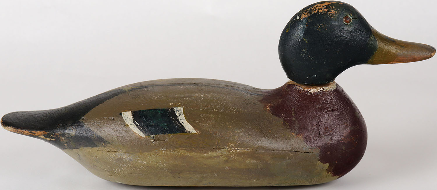 Mallard Drake by Mason Decoy Company, Detroit, MI, 1896-1924 standard grade, glass eyes, solid wood, head is loose, has age cracks, repainted. Grade: Very Good ++ - Value: 50 to 200