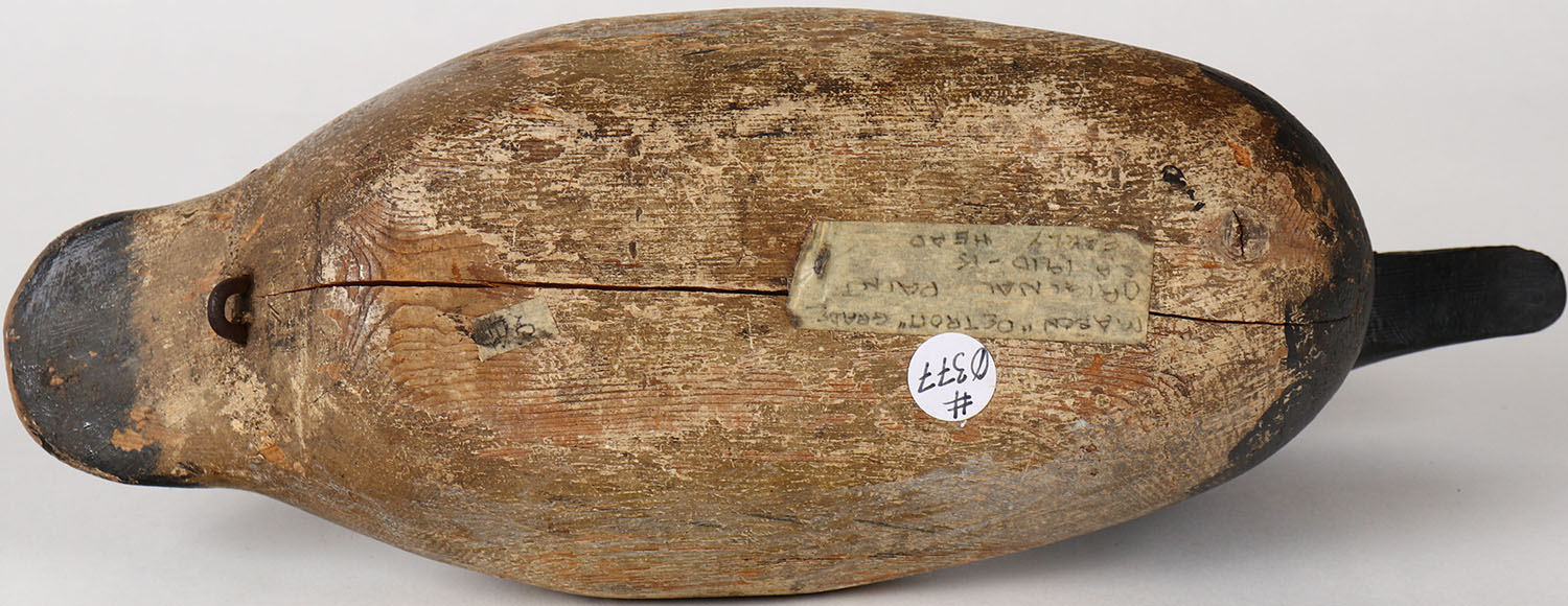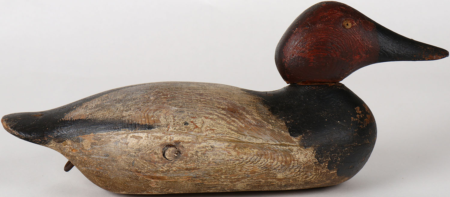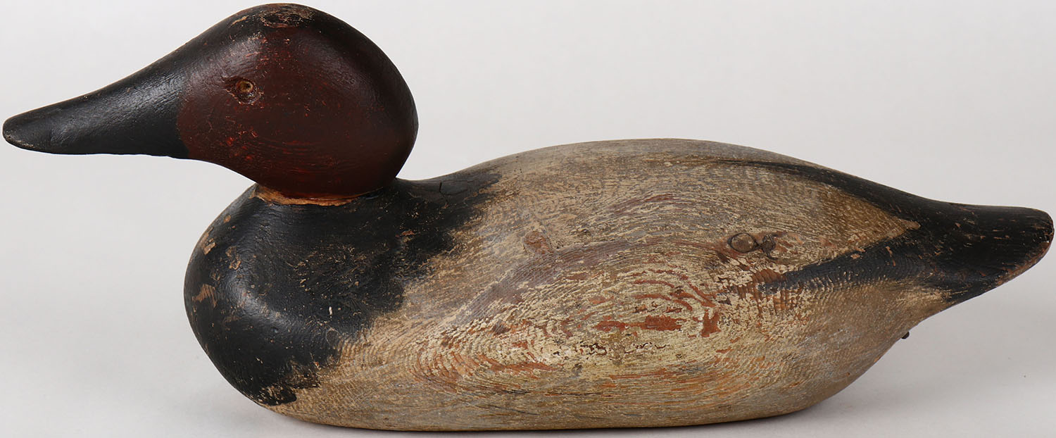 Canvasback Drake by Mason Decoy Company, Detroit, MI, 1896-1924 standard grade, no eyes, solid wood, head is loose, original paint. Grade: Very Good + - Value: 100 to 250