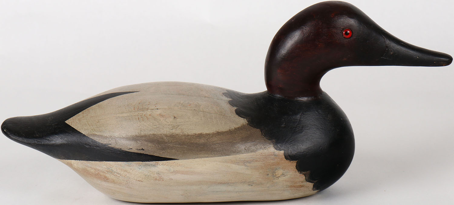 Canvasback Drake by Mason Decoy Company, Detroit, MI, 1896-1924 standard grade, glass eyes, solid wood, structurally excellent, appears to be repainted. Grade: Excellent + - Value: 50 to 150