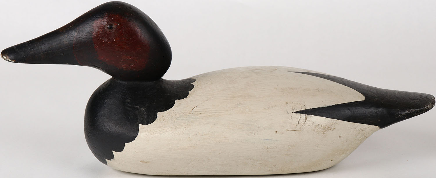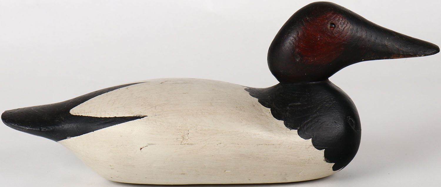 Canvasback Drake by Mason Decoy Company, Detroit, MI, 1896-1924 standard grade, glass eyes, solid wood, structurally excellent, repainted. Grade: Excellent + - Value: 50 to 150