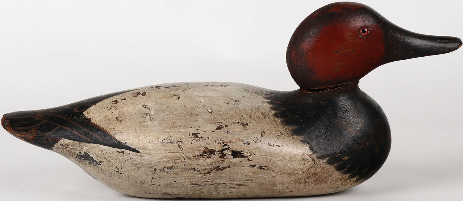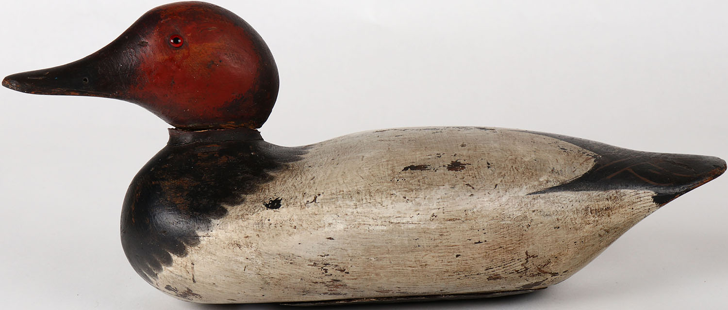 Canvasback Drake by Mason Decoy Company, Detroit, MI, 1896-1924 standard grade, glass eyes, solid wood, neck filler is missing, structurally excellent, re-painted. Grade: Very Good ++ - Value: 50 to 150