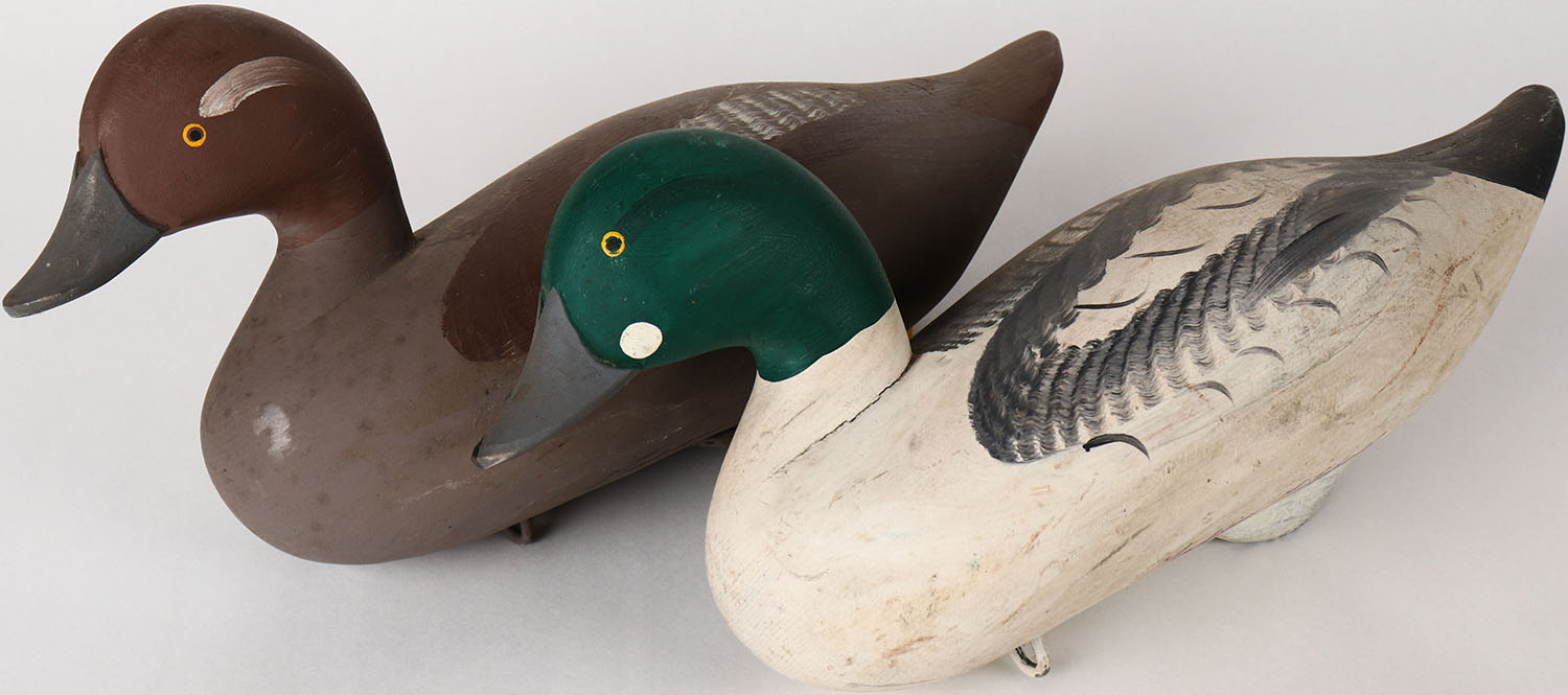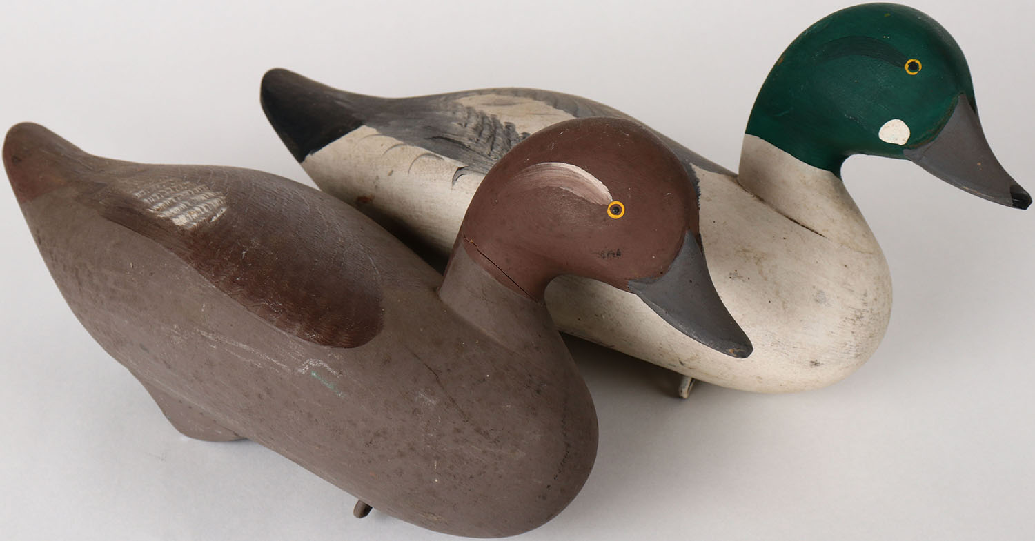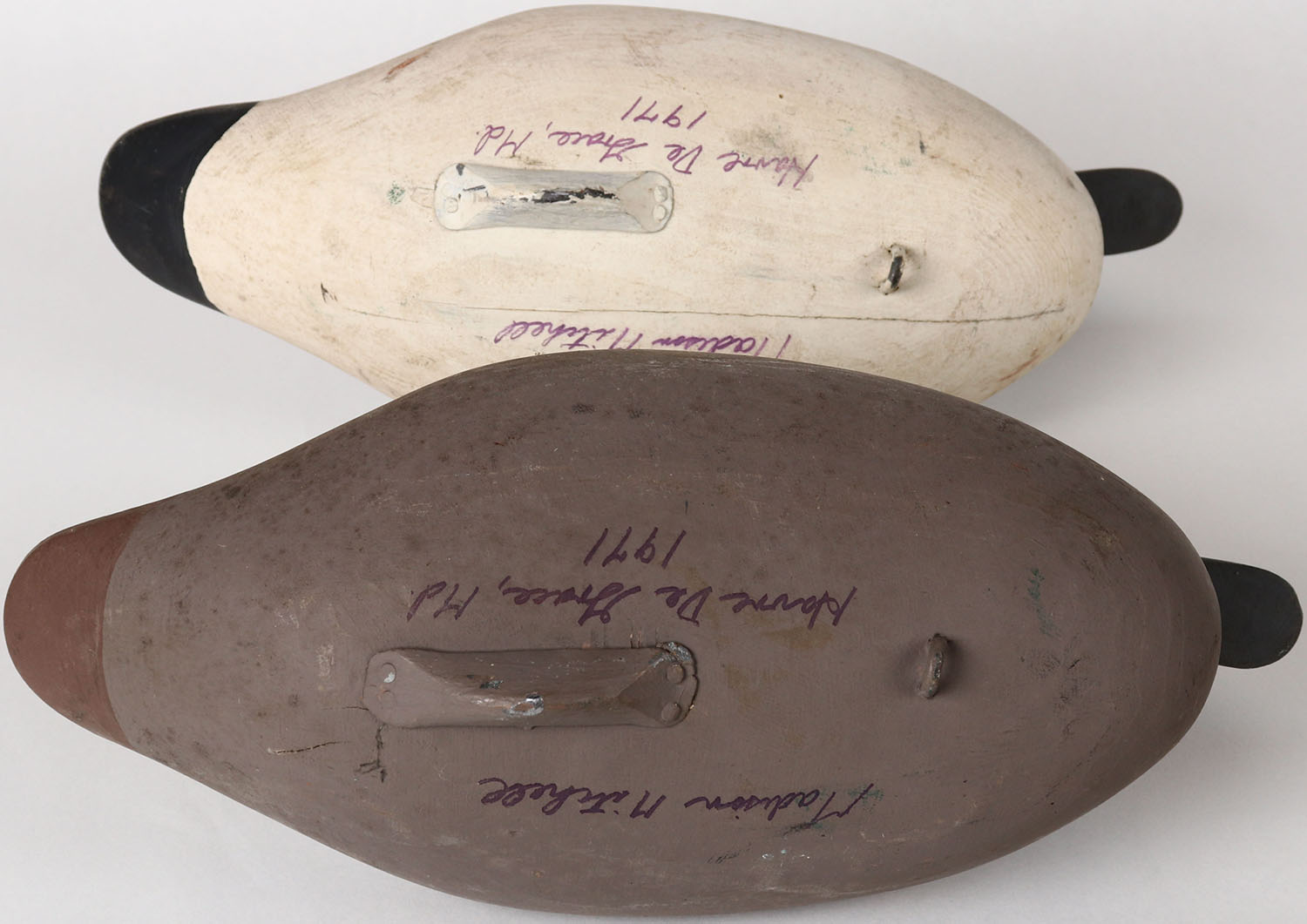Pair of Goldeneyes by R. Madison Mitchell, Havre De Grace, MD. Circa 1971, painted eyes, solid wood, structurally excellent, signed on bottom, original paint, drake has age cracks on bottom and neck. Grade: Excellent ++ - Value: 200 to 400