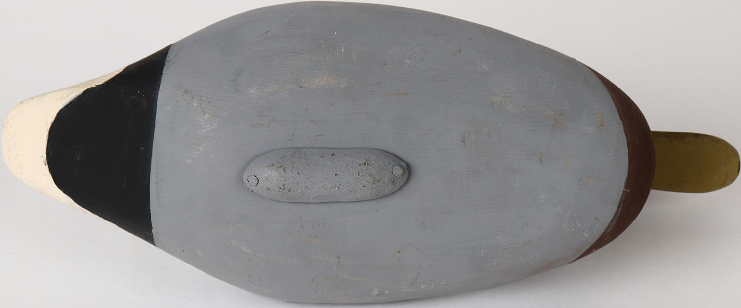 Mallard Drake by unknown maker, MD, painted eyes, solid wood, structurally excellent, branded and signed on bottom, original paint. Grade: Excellent + - Value: 50 to 100