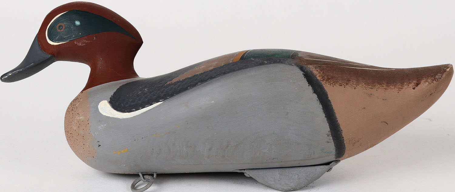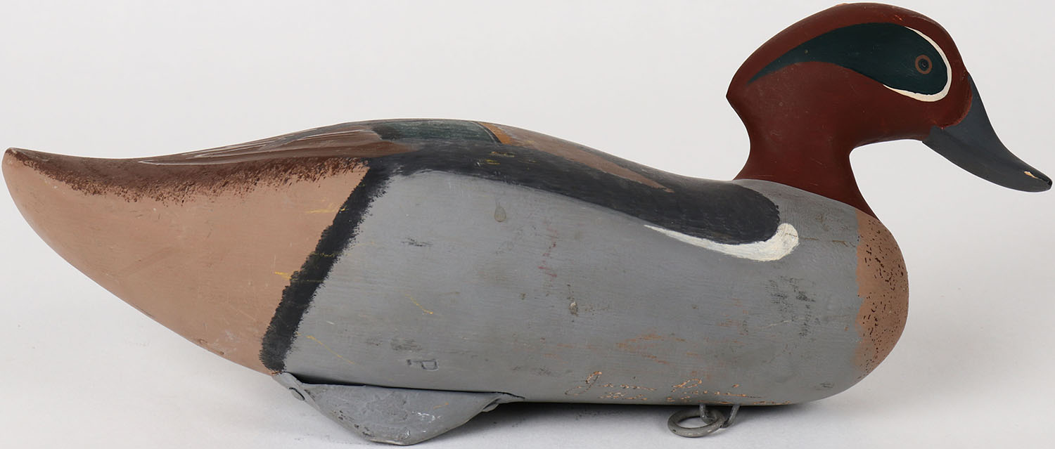 Green Wing Teal Drake by Jim Pierce, Havre de Grace, MD painted eyes, solid wood, structurally excellent, signed on bottom, original paint. Grade: MINT - Value: 50 to 150