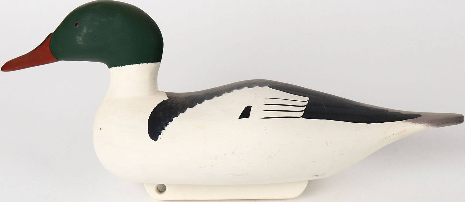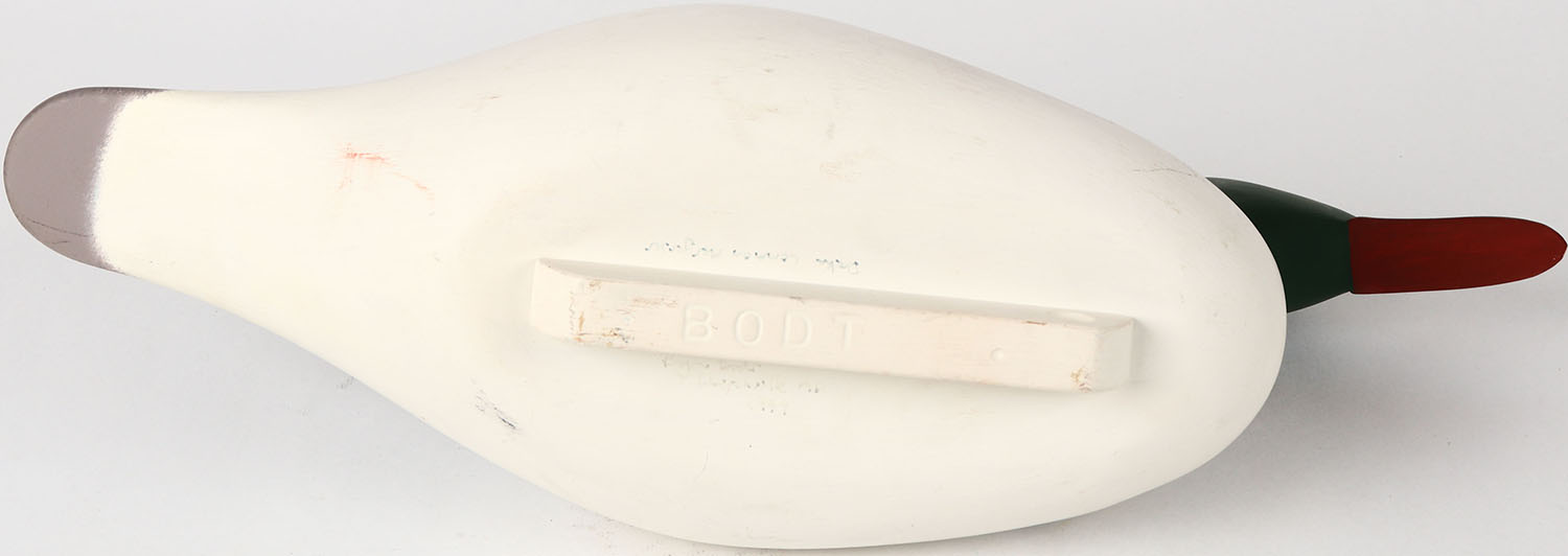 Common Merganser Drake by Bryon Bodt, Churchille MD, glass eyes, solid wood, structurally excellent, branded BODT on bottom and signed, original paint. Grade: Excellent ++ - Value: 50 to 100