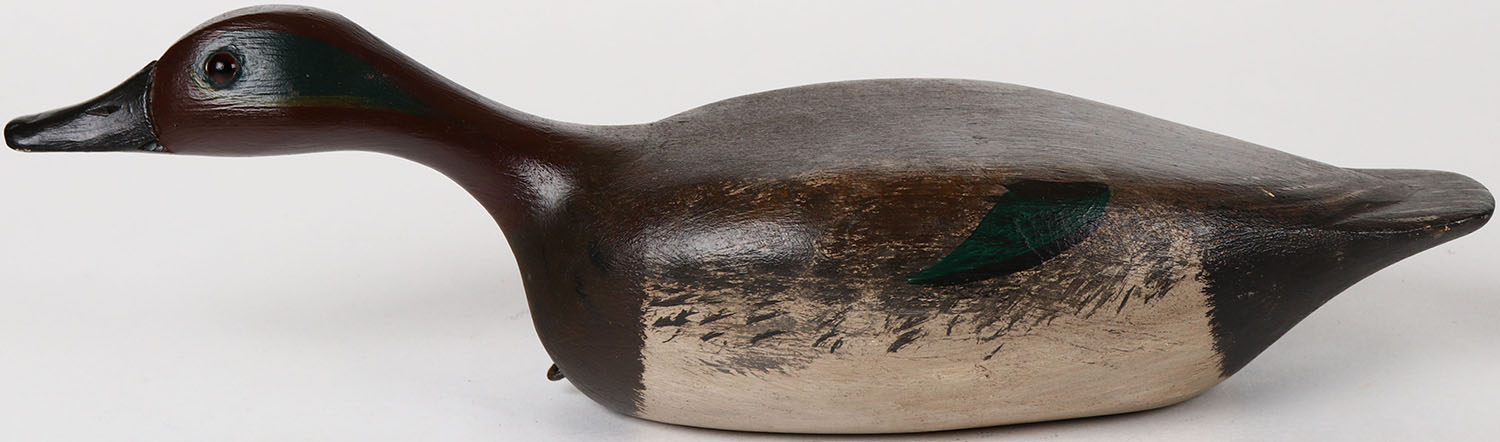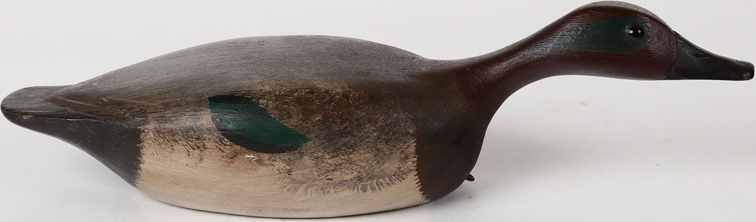 Swimming Green Wing Teal Drake by Jim Slack, Pekin, Illinois, glass eyes, solid wood, structurally excellent, signed on bottom, original paint. Grade: MINT - Value: 100 to 200
