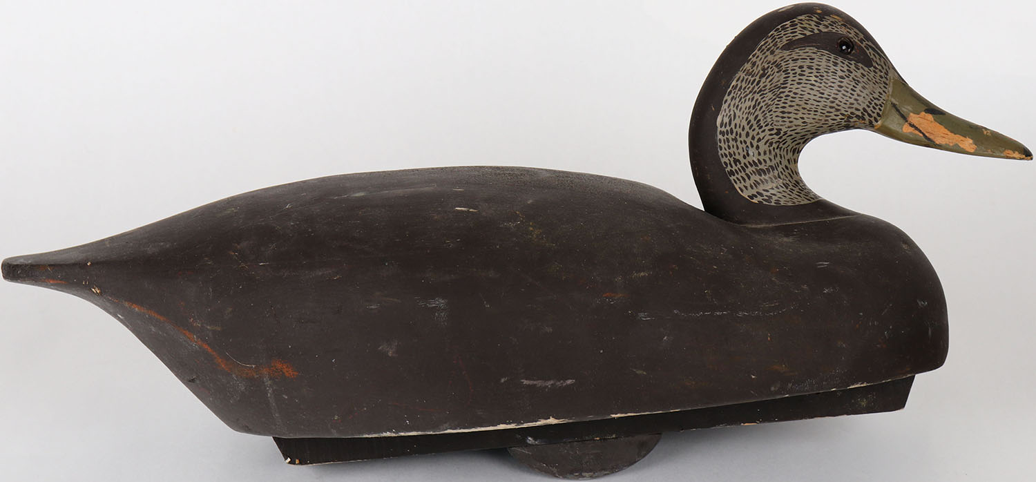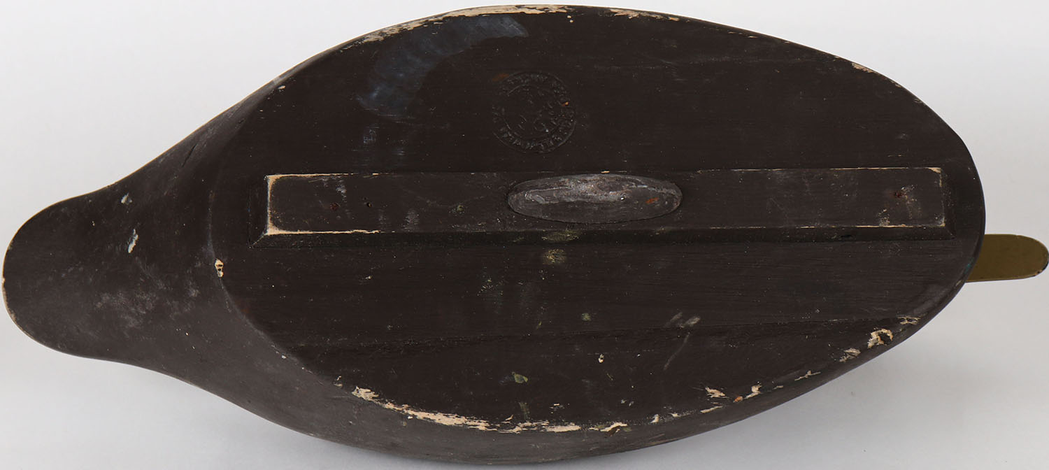 Black Duck by Wildfowler Decoys, glass eyes, solid wood, structurally excellent, branded on bottom, original paint. Grade: Excellent + - Value: 50 to 100