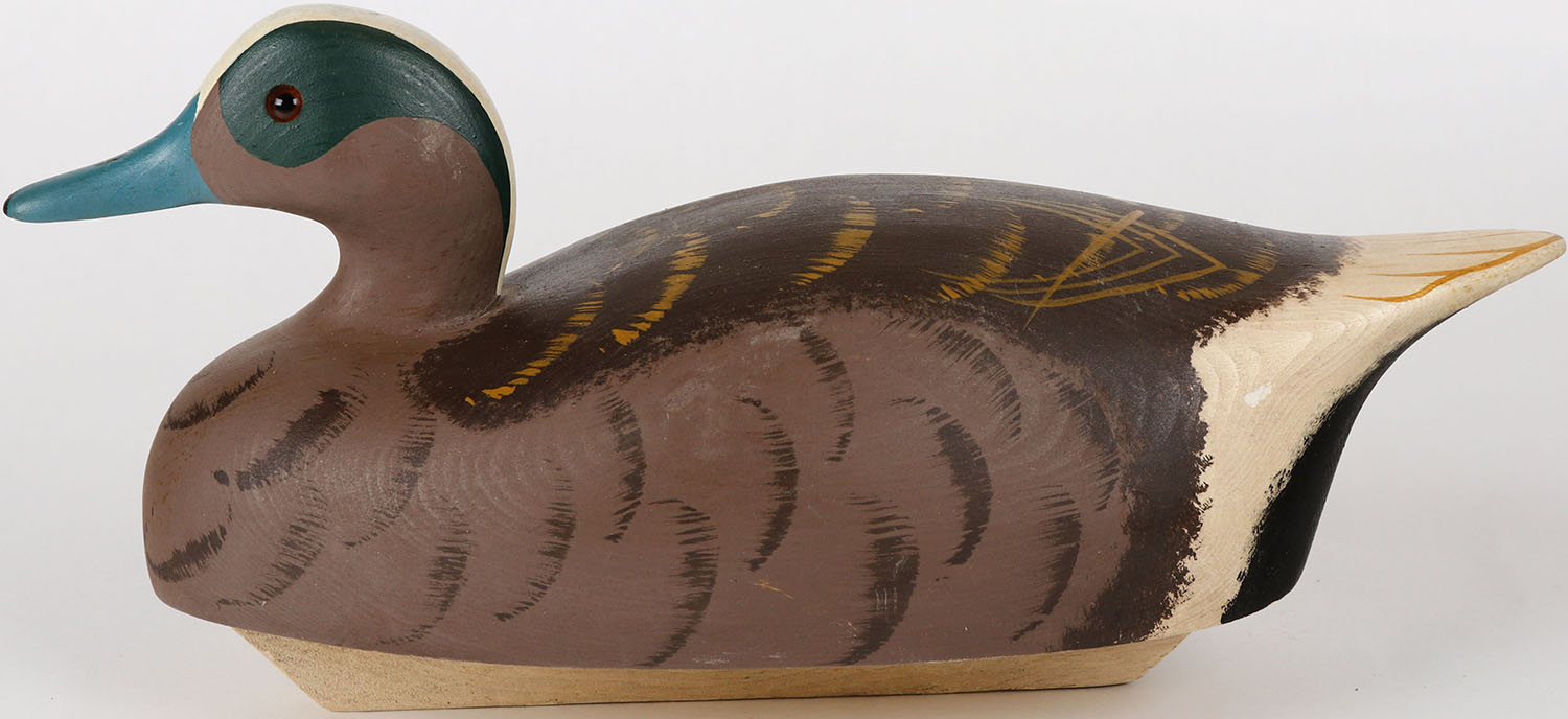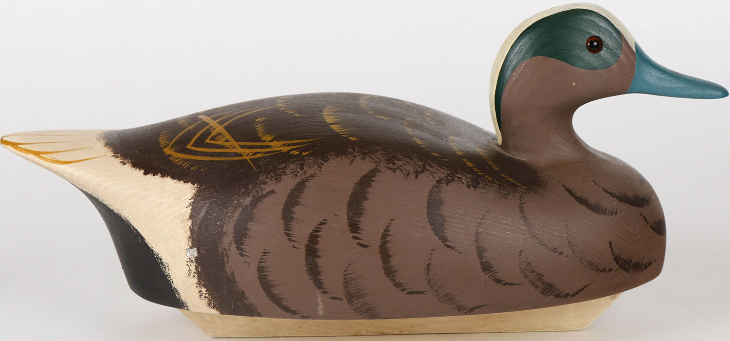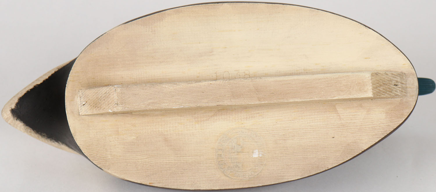 Widgeon Drake by Wildfowler Decoys, Bohemia NY, glass eyes, solid wood, structurally excellent, stamped on bottom, original paint. Grade: Excellent ++ - Value: 30 to 60