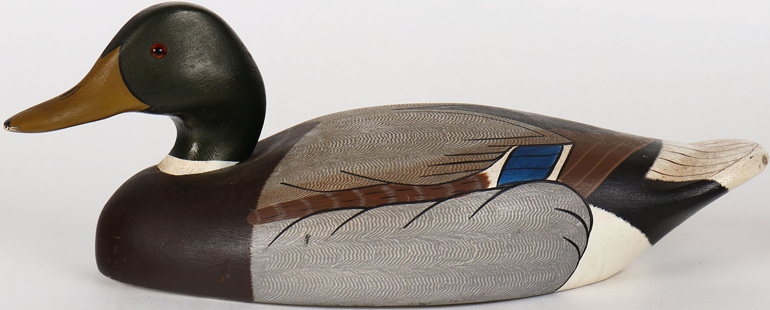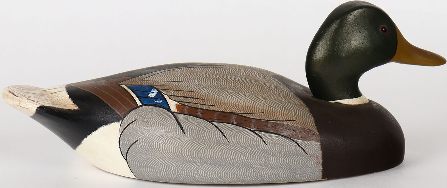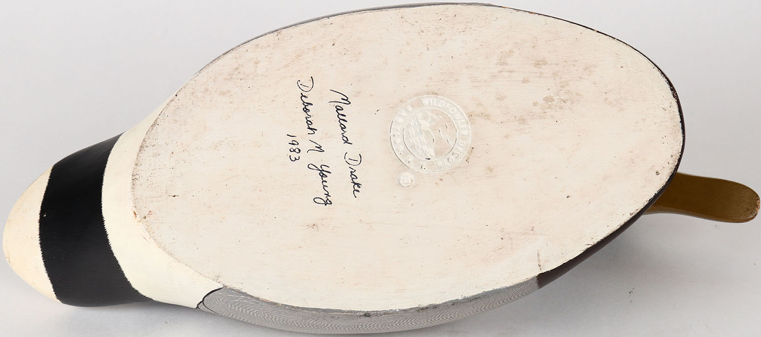 Mallard Drake by Deborah M Young, (1983) Wildfowler Decoys, Babylon, N.Y. glass eyes, solid wood, structurally excellent, stamped and signed on bottom, original paint with comb painting. Grade: MINT - Value: 100 to 200