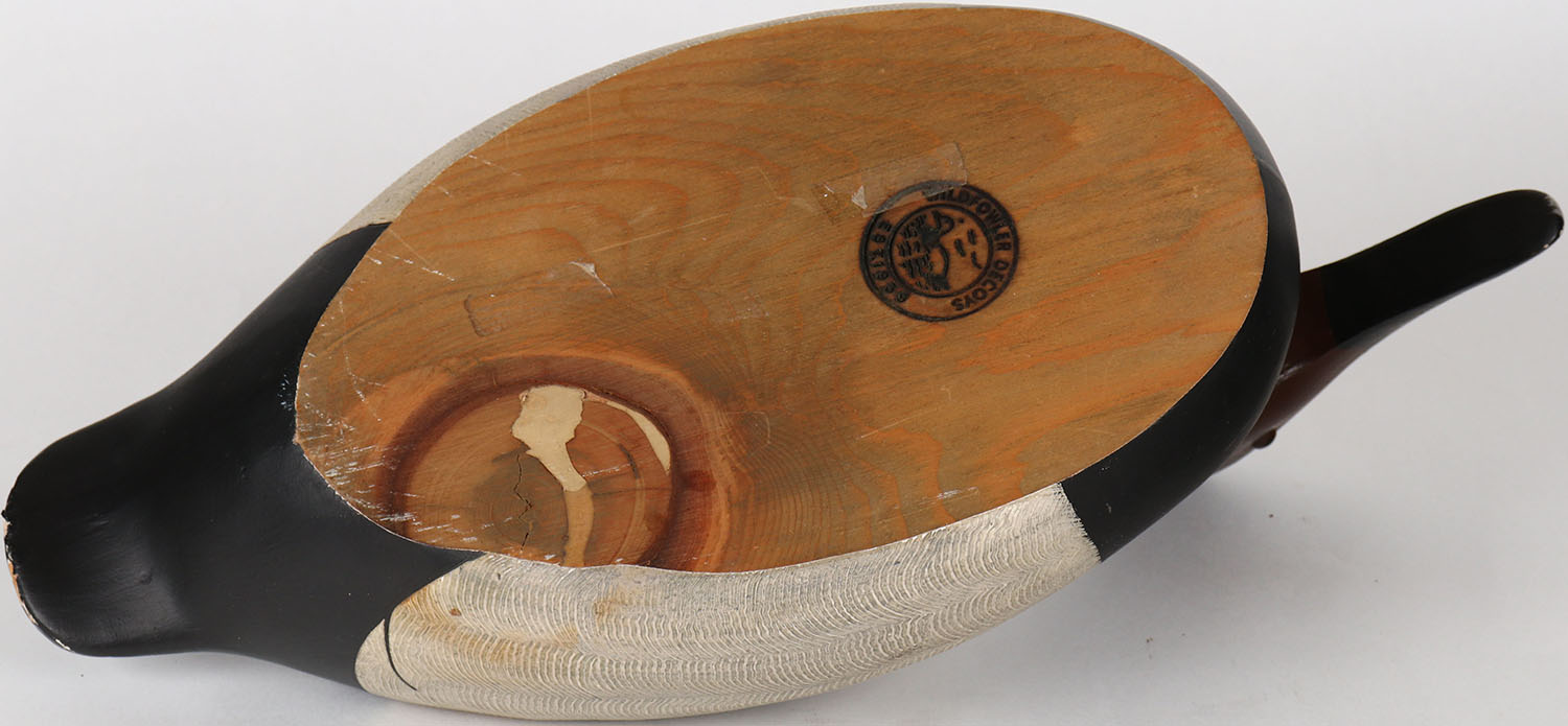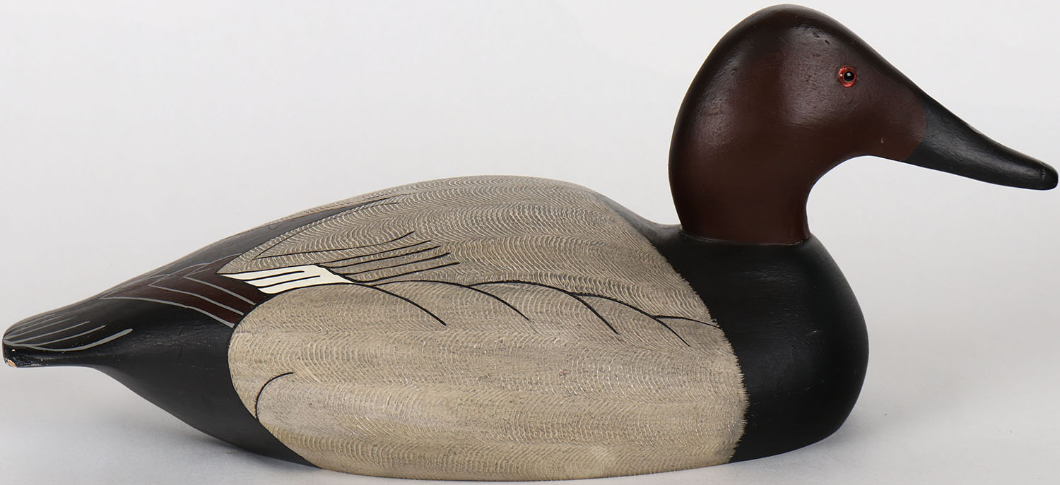 Canvasback Drake by Wildfowler Decoys, glass eyes, solid wood, structurally excellent, branded by WILDFOWLER DECOYS on bottom, original paint with comb painting. Grade: MINT - Value: 30 to 60