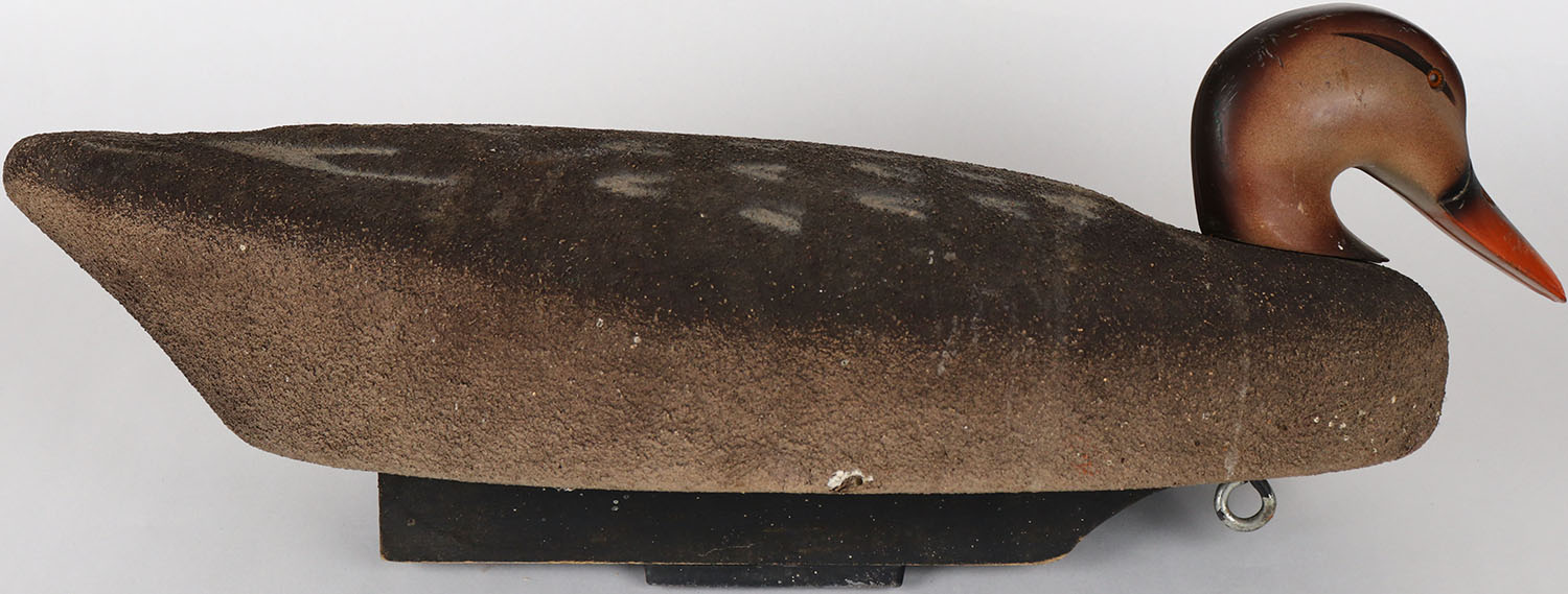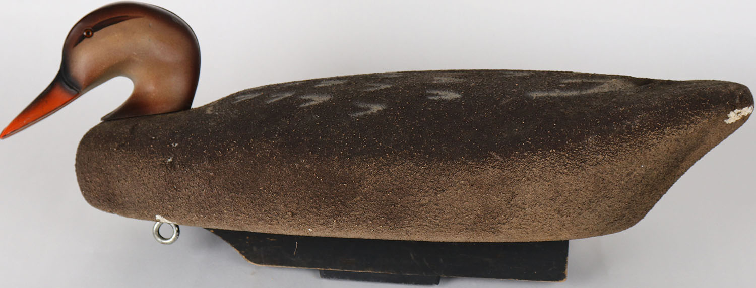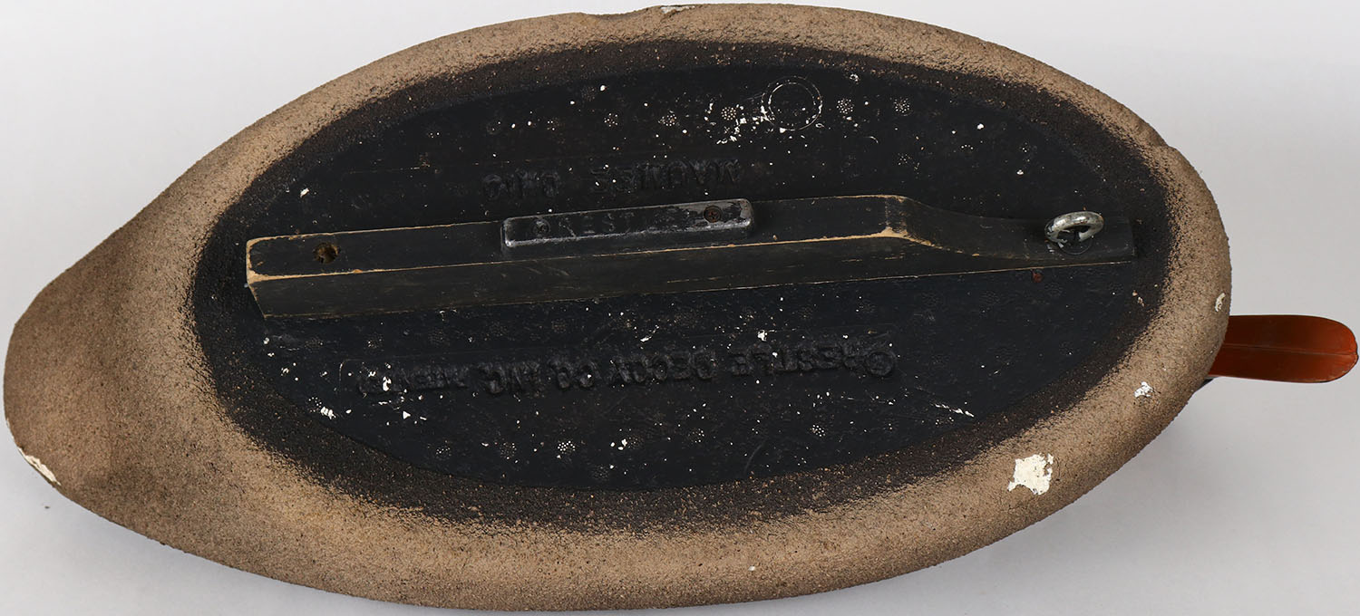 Mallard Hen by Restle Decoy Co, Maumee Ohio, glass eyes, balsa wood, structurally excellent, branded on bottom, original paint. Grade: Excellent + - Value: 30 to 60