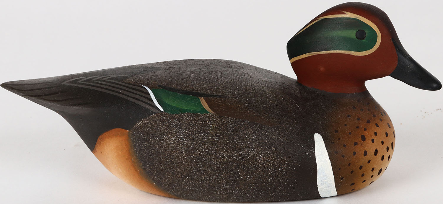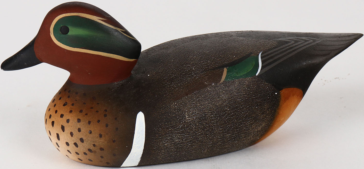 Green Wing Teal Drake by Bill Schauher, (1999) tack eyes, solid wood, used at Sudlersville Skeet Club, structurally excellent, original paint. Grade: Very Good ++ - Value: 50 to 100