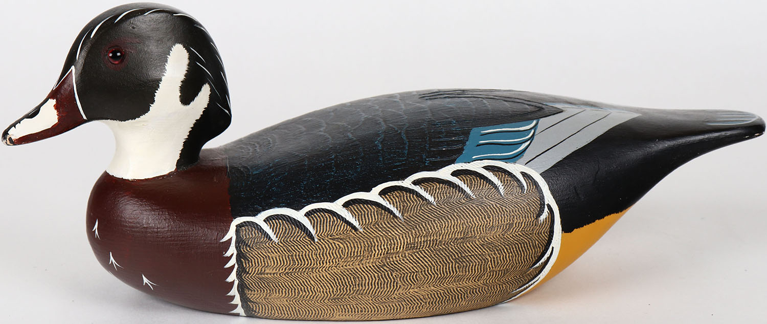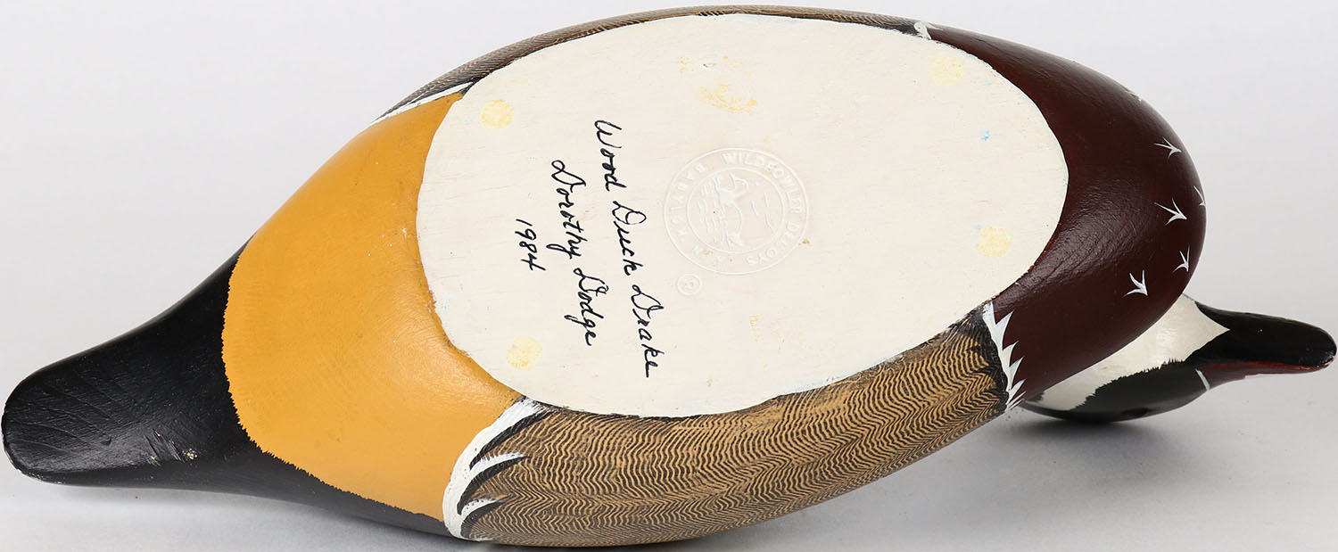 Wood Duck Drake by Wildfowler Decoys, Babylon, N.Y, glass eyes, solid wood, structurally excellent, stamped and signed on bottom, original paint with comb painting. Grade: MINT - Value: 40 to 80