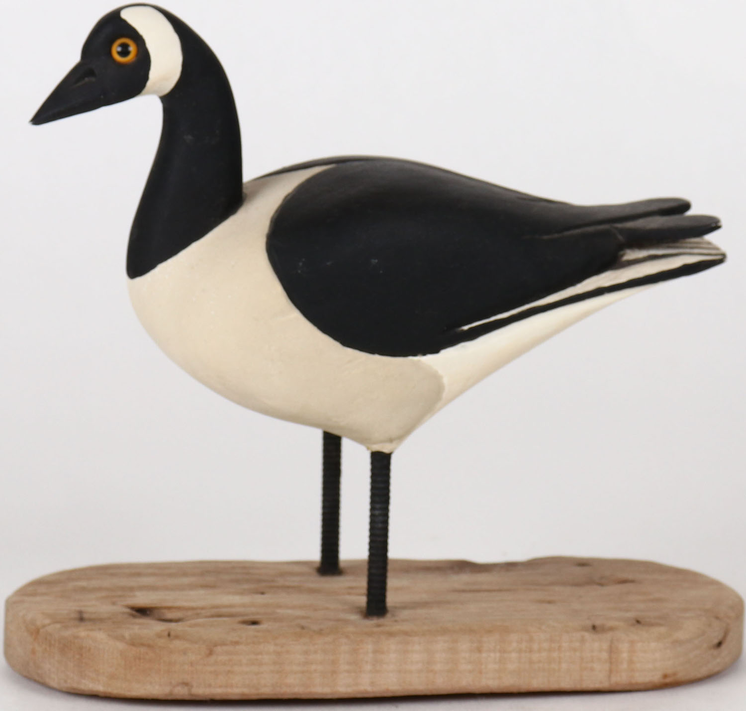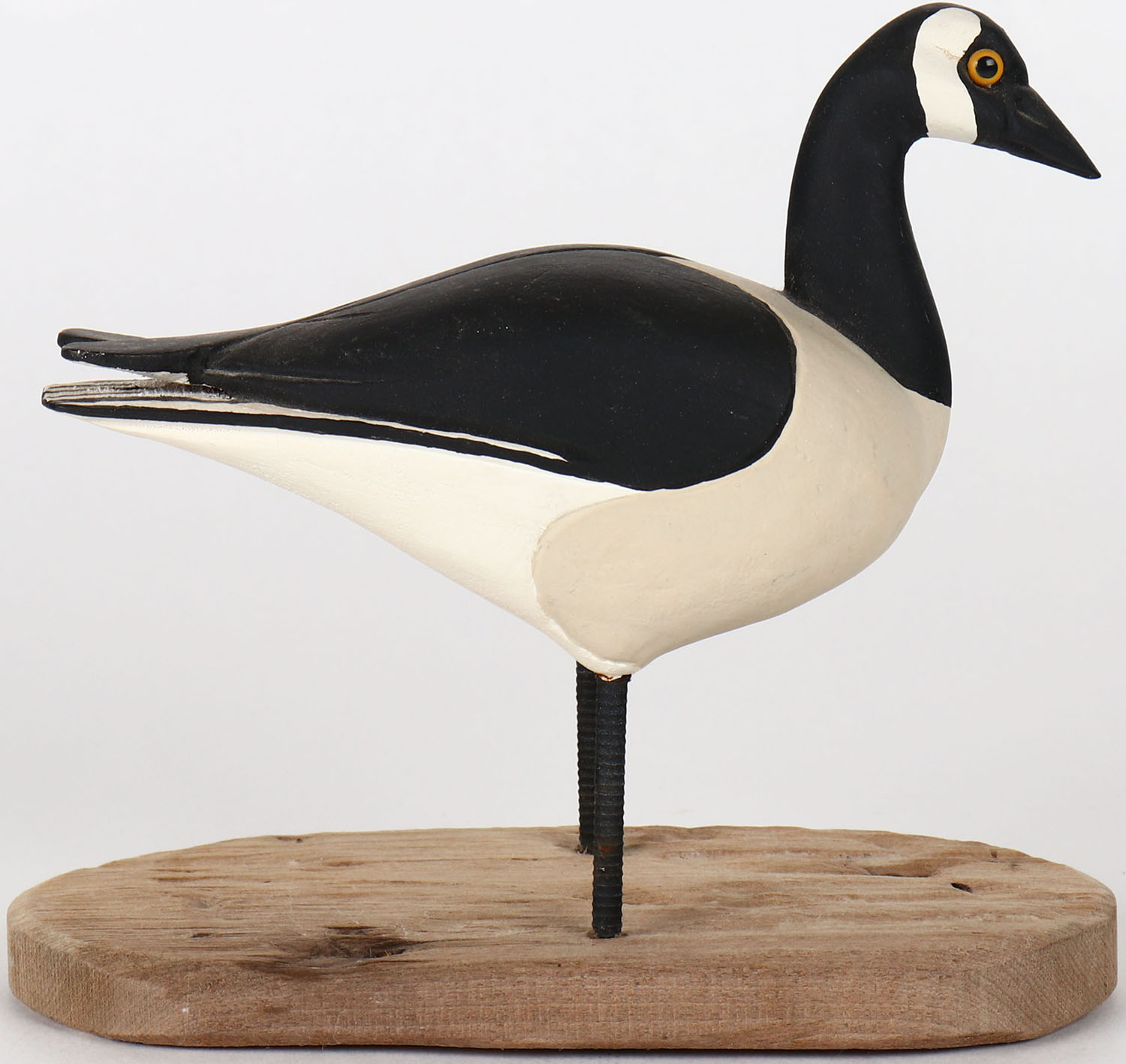 Standing Canada Goose by C.F.W. on wood stand, glass eyes, solid wood, structurally excellent, signed on bottom, original paint. Grade: MINT - Value: 20 to 40