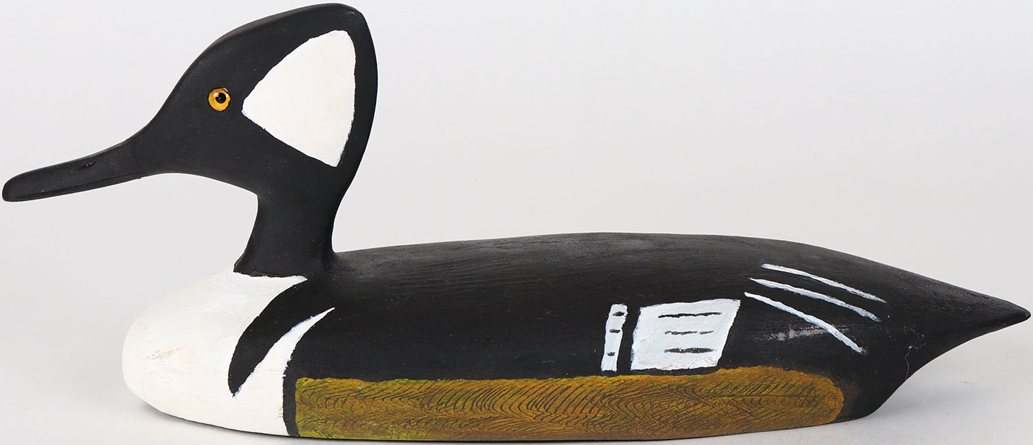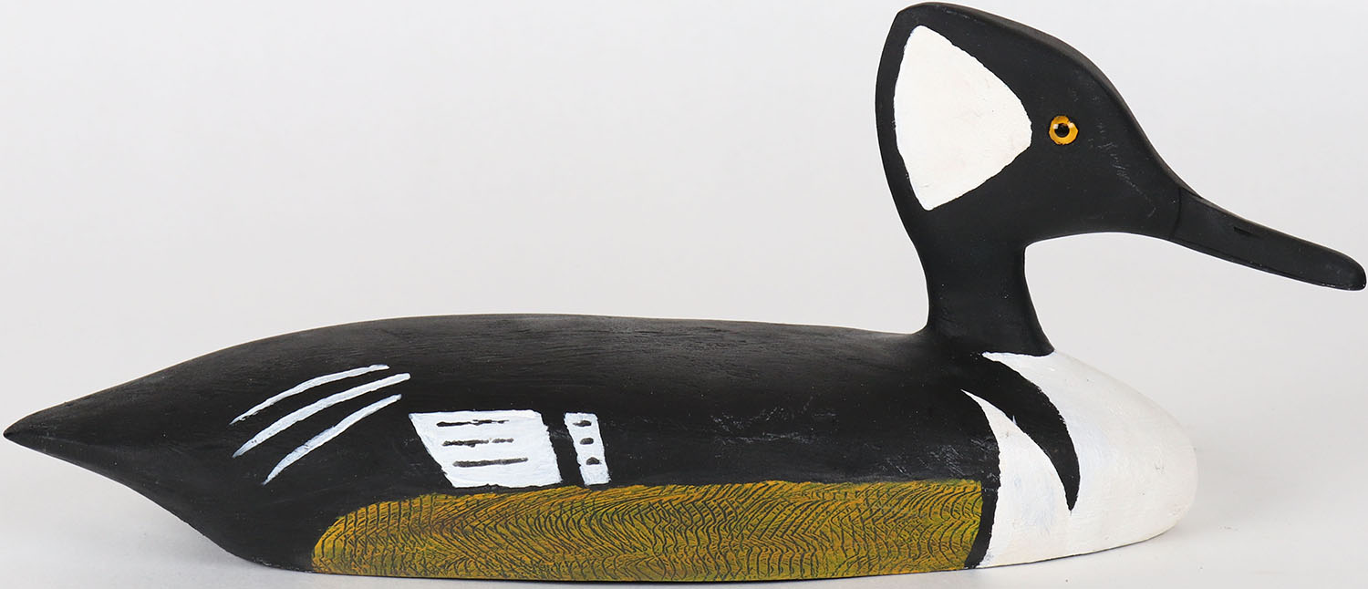 Hooded Merganser by Maynard Caine, Ontario, Canada, glass eyes, solid wood, structurally excellent, branded M on bottom, original paint, comb painting on side. Grade: MINT - Value: 30 to 60