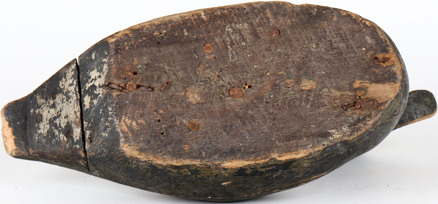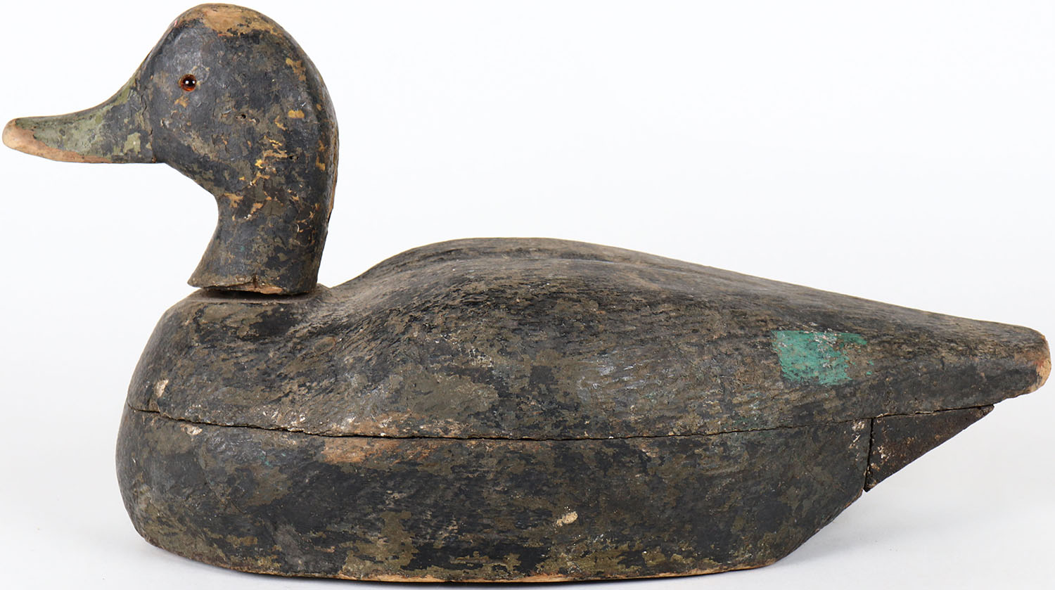 Black Duck by unknown maker, glass eyes, solid wood, head is loose, has age crack around body, original paint. Grade: Very Good - Value: 20 to 60