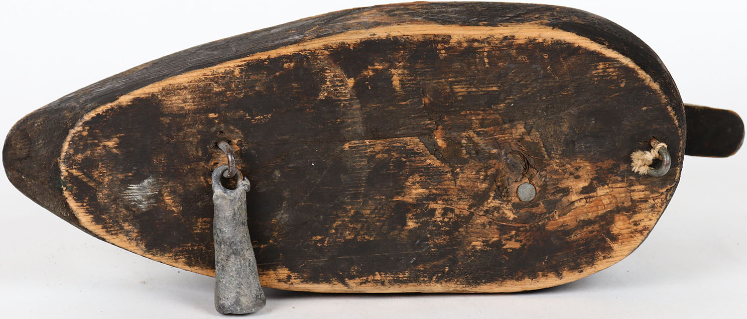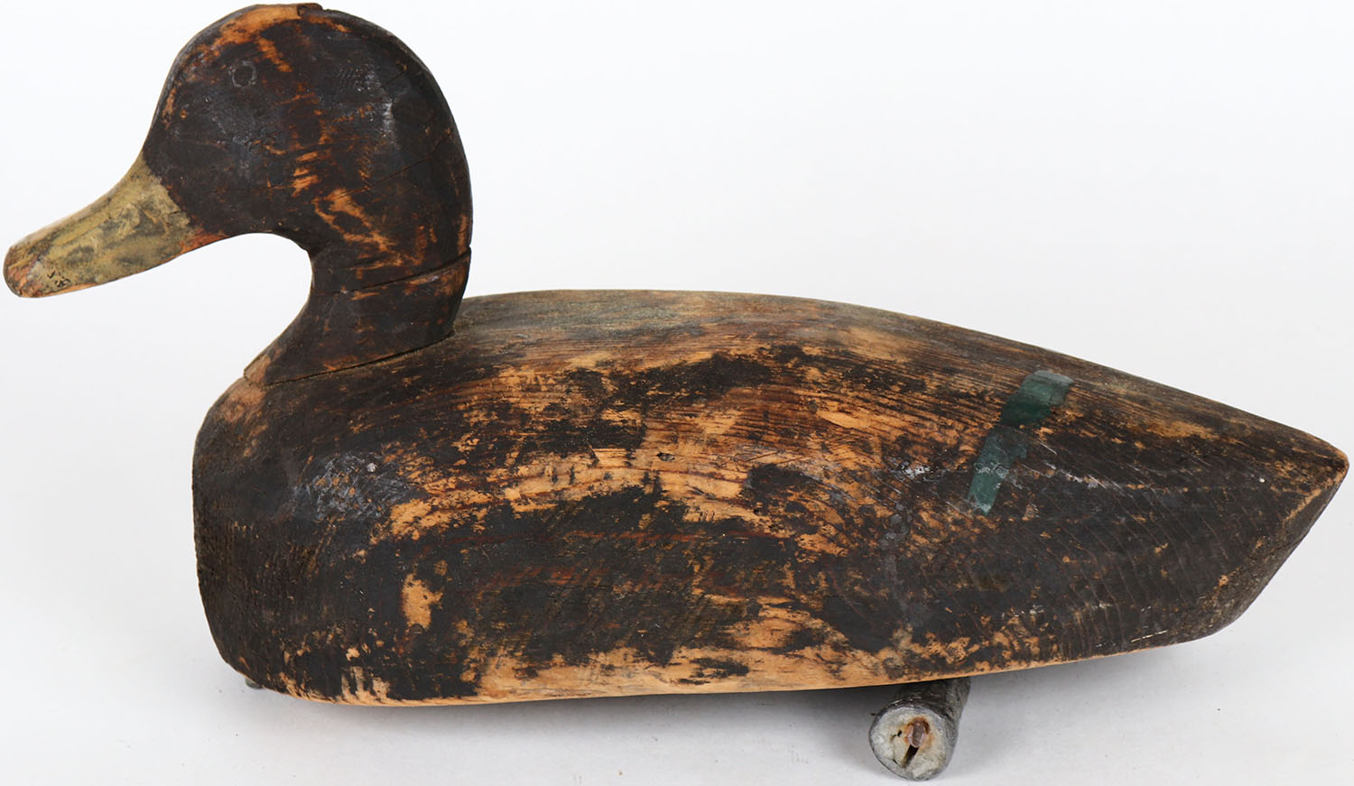 Black Duck by unknown maker, painted eyes, solid wood, neck is loose and cracked, original paint. Grade: Very Good + - Value: 10 to 20