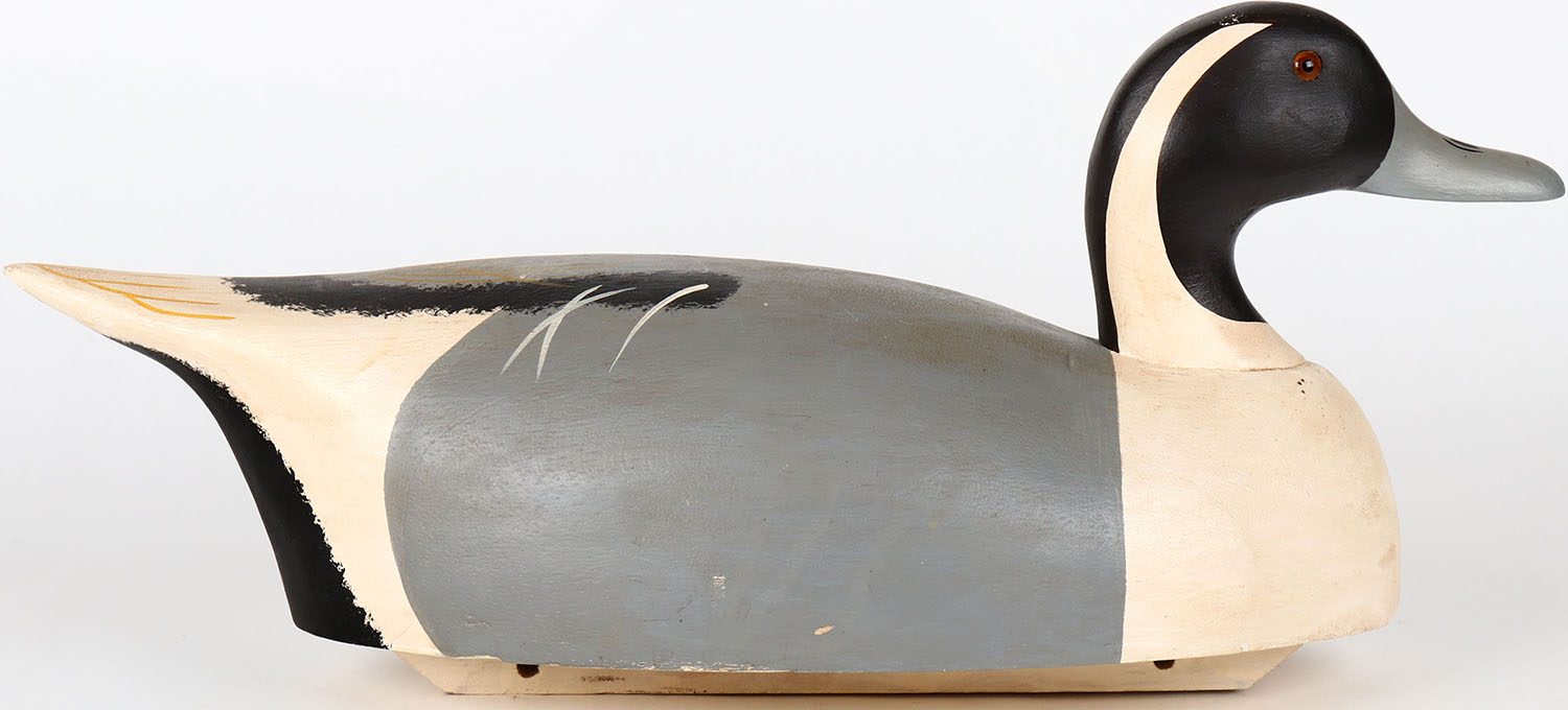 Pintail Drake by Wildfowler Decoys, Babylon, N.Y. glass eyes, hollow wood, structurally excellent, branded on bottom, original paint. Grade: MINT - Value: 50 to 150