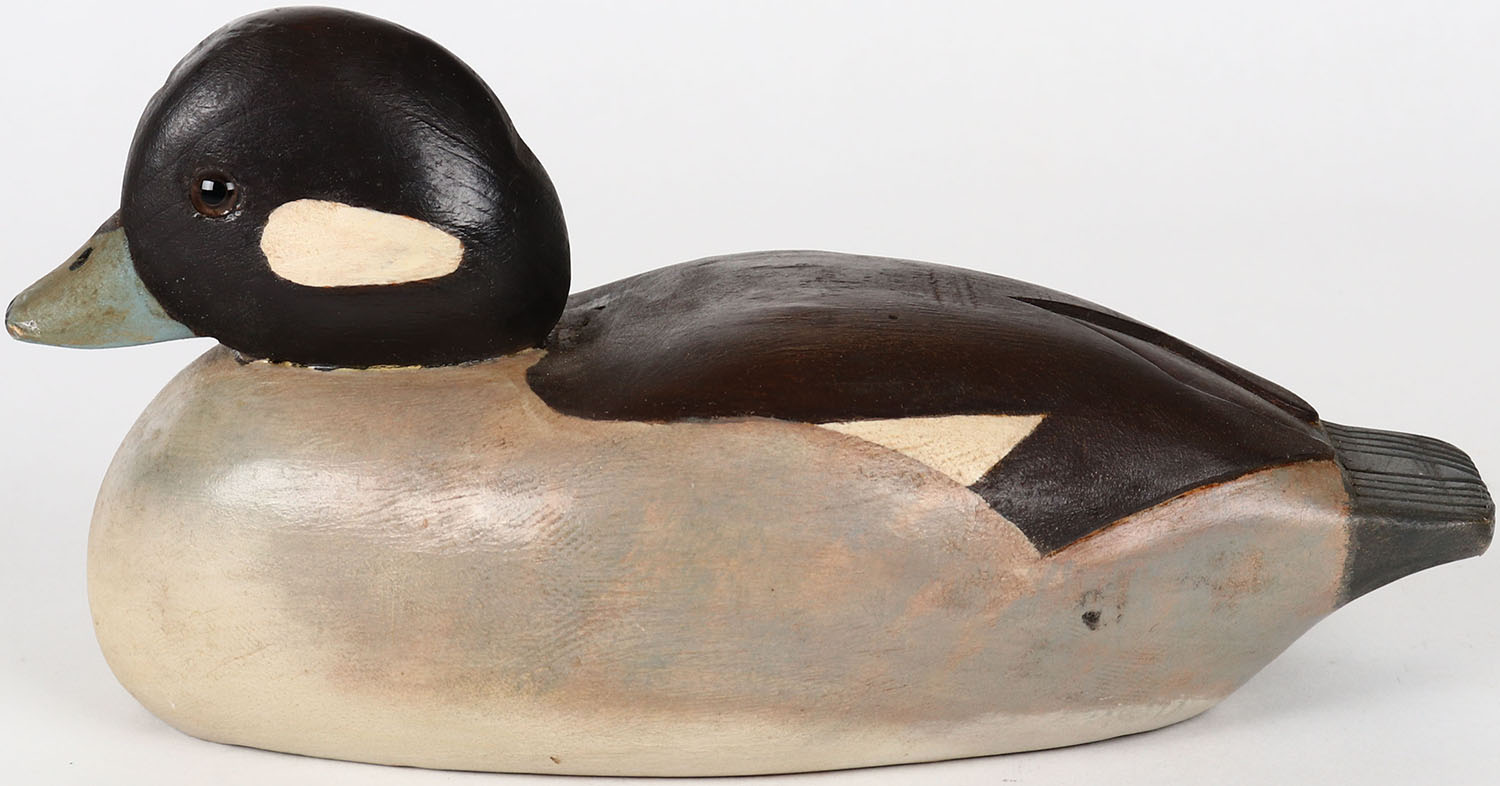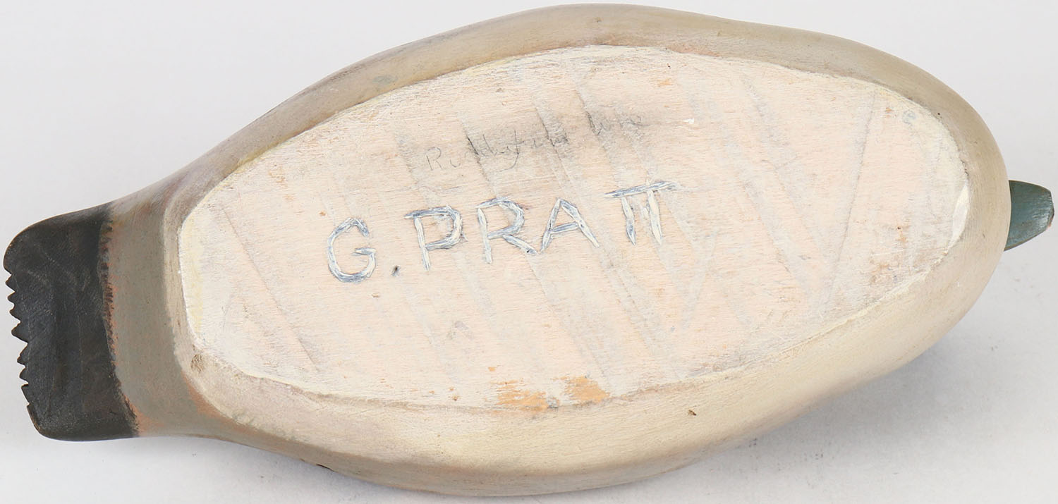 Bufflehead Hen by G. Pratt, glass eyes, solid wood, structurally excellent, signed and branded G. PRATT on bottom, original paint. Grade: MINT - Value: 70 to 150